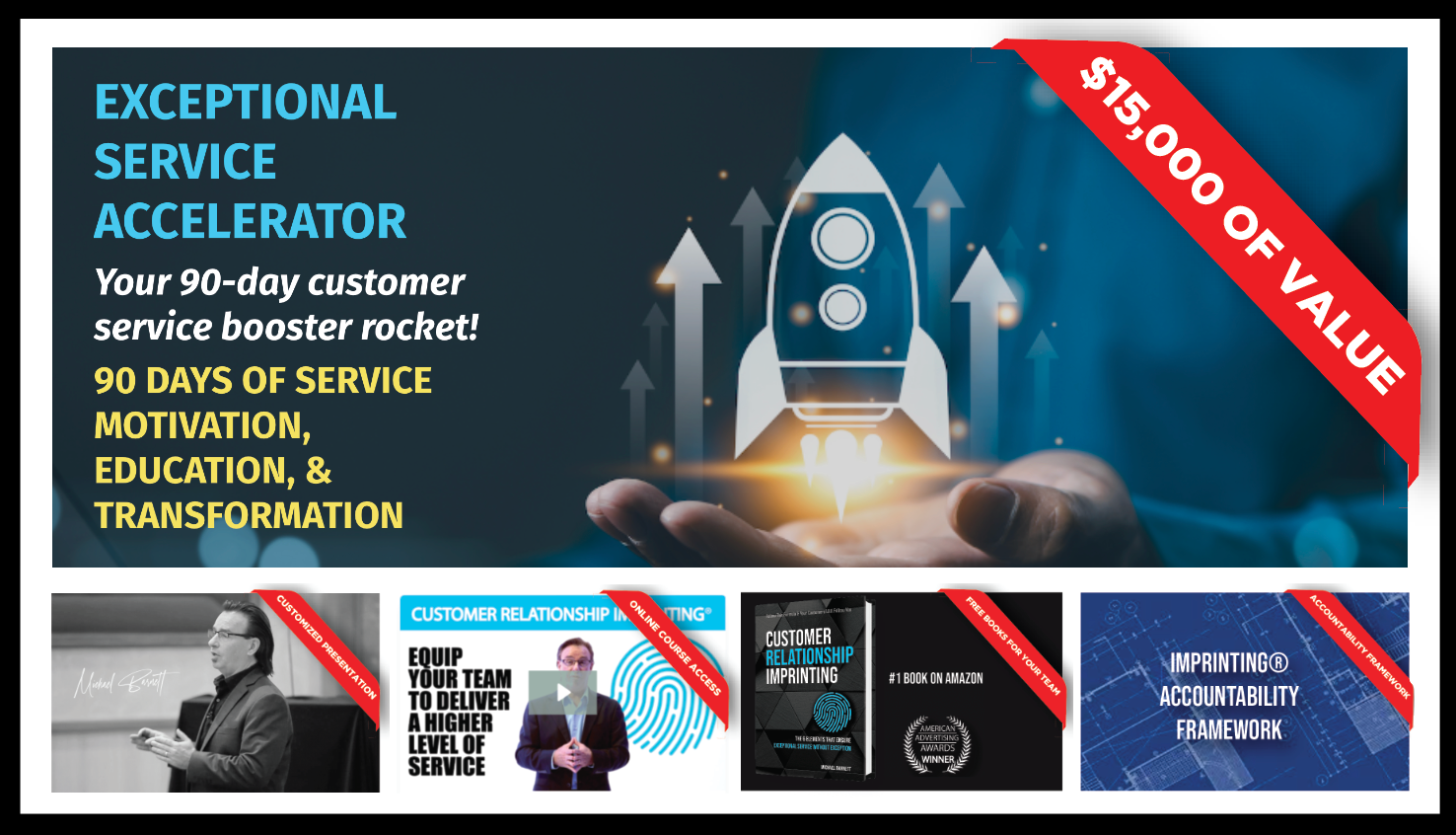 The 90-day customer service booster rocket! You get a motivational presentation, full access to the Imprinting® online course, a free book for every team member, and the Imprinting® accountability framework!